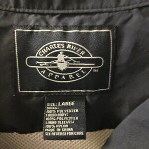 Experience the perfect blend of style and practicality with this Charles River apparel windbreaker. Its sleek dark blue and white design is crafted from a smooth, water-resistant material, ensuring you stay dry and comfortable. The stand-up collar and contrasting dark zipper add a modern touch to this versatile jacket.