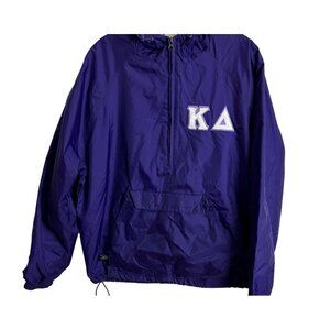 This Kappa Delta anorak jacket is designed for style and comfort. Made from durable nylon, it features an adjustable hood and a convenient kangaroo pocket. The PURPLE color and embroidered Greek letters add a distinctive touch, suitable for windy or light rain conditions. Size Medium Sku 3353 Unisex / Men's