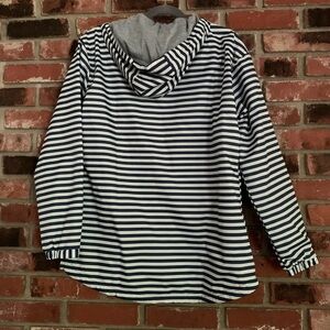 Nautical pullover jacket with navy and white stripes. Features a front zipper and pocket. Soft Cotton Lining Hooded