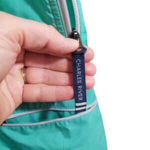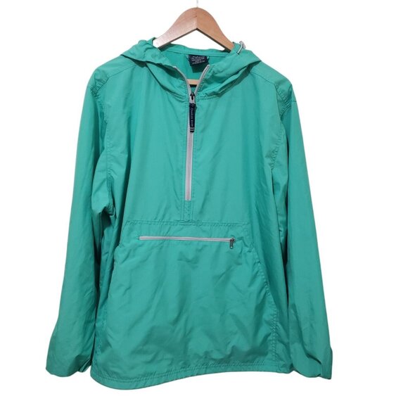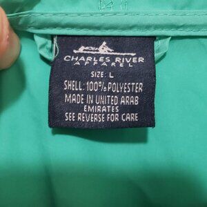 Charles River men's windbreaker jacket, mint green, size large. Jacket is lightweight and ideal hiking, walking, or just casual wear. It features a 1/4 zip closure, front zip pouch, elastic wristbands, an pull-cord hood, and a pull-cord closure on the bottom of the jacket, and slant pockets for carrying your items. Perfect for a cool, crisp spring or fall day!