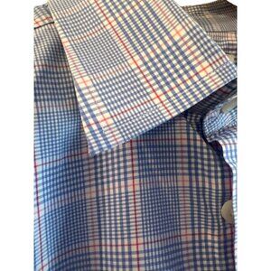 This men's button-down shirt from Charles Tyrwhit boasts a vibrant red, white, and blue check pattern. Made from 100% cotton, the shirt offers a comfortable fit with measurements of 16 1/2 by 33.