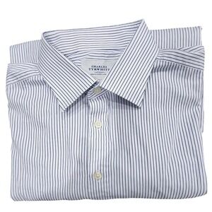 Step into sophisticated style with this elegant Charles Tyrwhitt dress shirt. The classic pinstripe pattern, rendered in a crisp white and navy blue, offers a timeless appeal. Crafted in a slim fit design, this shirt accentuates the wearer's physique. The long sleeves and buttoned cuffs add a touch of formal refinement, making it an ideal choice for professional settings, business-casual events, or a smart evening out.