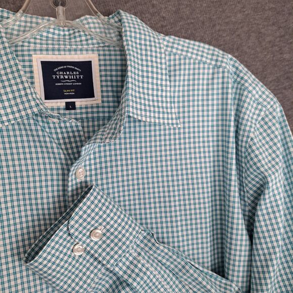 Charles Tyrwhitt Dress Shirt Mens Large Green Grid Check Non Iron Slim Fit