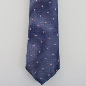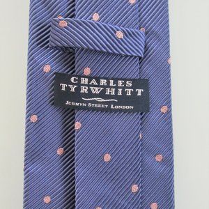 Description: Up for sale is a Charles Tyrwhitt men's silk tie. The tie is made in Italy of 100% textured silk. It has a light pink polka dot design on a violet-colored background. Dimensions approximately 58" long x 3.90" wide. This tie is in excellent condition.