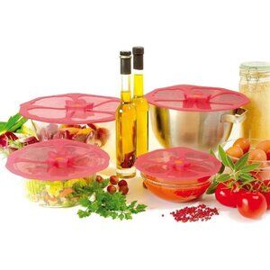Like new set of 4 silicone Charles Viancin - 12", 10", 9", and 7" hibiscus design universal lid to cover almost all your containers. Airtight seal on almost any smooth-rimmed surfaced pot, pan and bowl whether made of glass, plastic, stainless steel, cast iron. Keep food cool or hot. Oven and microwave safe silicone withstand temperatures of -40 to 428 degrees F.