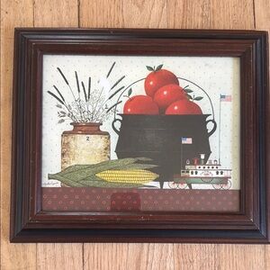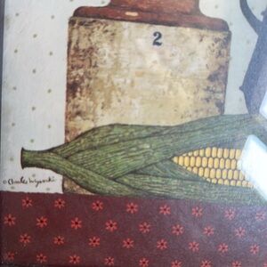 The image is a print titled "Still Life with Corn" by the American folk artist Charles Wysocki, known for his nostalgic portrayals of American life. This particular piece features a rustic still life composition, highlighting elements such as corn, a pot of red fruits, and a small steamboat with American flags.