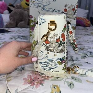 Elegant white handbag featuring a vibrant floral rabbit print. Perfect for adding a touch of style to any outfit.