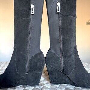 Charles by Charles David Black Suede, Wedge Heeled Boots, Women’s Size 7M. These beautiful boots have stretchy material at the back of boot & side zipper for added fit & comfort. Some wear on the soles of the boots as noted in the photos. Please consider bundling for the best deal. Thank you for shopping.