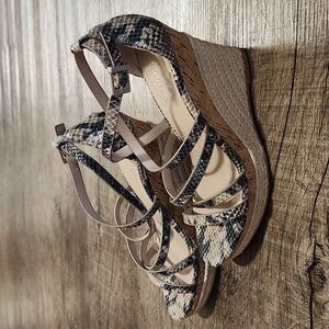 Charles by Charles David strappy snake print espadrille wedge sandal, 1" platform height and 3.5 to 4" heel height. Colors are black, dark gray, beige, and a little cream. Stunning sandals in person! Stable despite their height. Excellent used condition and very clean. Size 6.5