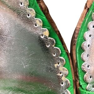 Fun slip on shoes by Charles by Charles David. Wedge cork heel with bright green. Bigger strap is clear with green trim. Heel is 2.5" and front platform is 1"
