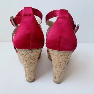 Charles By Charles David Lauryn Platform Cork Wedge Sandal in Scarlet Satin. Women's size 8M. In original package from Nordstrom. Still great condition with hardly any wear. Slight darker spot on red satin under where your toe sits.