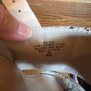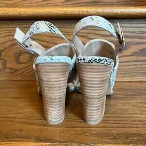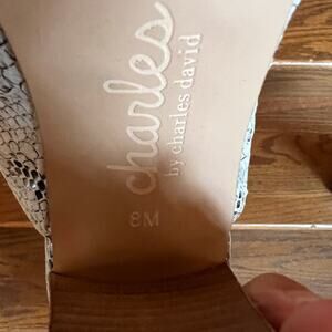 SIZE 8M - These Charles by Charles David Reptile Maison Block-Heel City Sandals are gorgeous! Lift your boho vibe with the Maison. Thick quilted strap with block heel, makes for the perfect summer pump. Heel Style: Block, Toe Style: Square ● 3.54 Inch Heel ● Leather upper, synthetic lining, and synthetic sole COLOR Reptile white/grey, gold & brown