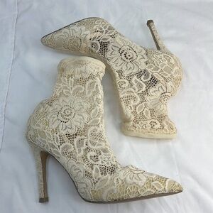 This is a beautiful pair of Charles by Charles David Sz 6 Women's Player Elastic Lace Boots. Cream off white lace with elastic and elastic top. Pointed toe. Base of a pump with full lace overlay. Worn once indoors. Some very minor make up spots at the rim. Otherwise excellent condition