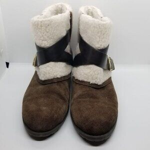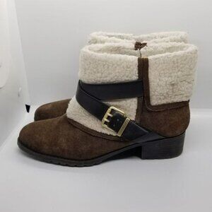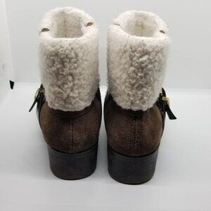 Cute ankle boots in a brown faux suede with cream faux fur or faux sherpa over the ankle. Decorative buckle. Stretch panels to pull on/off. Soles in great condition! Sherpa has a little bit of dye transfer from jeans or blue-ish pilling around the ankle. These have been worn in the presence of pets, and have been lint rolled, but there may be some hair or dander that's deeply embedded in the faux fur.