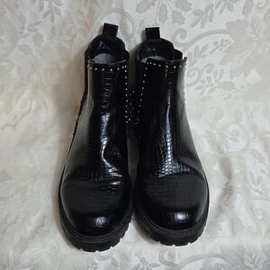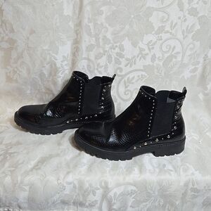 Great boots if you are looking for something stylish with a low heel. Pull on style with side stretch panels. Big studs are gold small are silver. Good overall condition