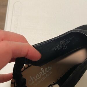 Charles by Charles David “Nadja” wedges. Top of shoe is black suede and the base is woven. Design is peep toe & back of shoe is designed with elastic for easy slip-on. Size 7.5 women’s. Originally $90. Very good condition! Smoke free home!