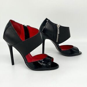 Combination smooth and patent leather. Inside zip. Suede leather ball pad. Heel measures approximately 4.5 inches. In excellent condition with hardly signs of wear. All pics show actual product.