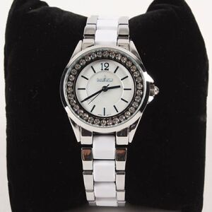 This Charles Latour Voluta II Ladies Watch features a silver bracelet with white inserts, silver case, cubic zirconia stone bezel, silver chapter ring, white Mother of Pearl dial center and blue accents. This watch is brand new, still in the box, and never opened. Includes full 1 Year Warranty direct from the Manufacturer....MSRP $395