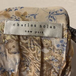 Blue and ivory floral pleated skirt with metallic gold thread pattern throughout from Charles Nolan. Size 14.