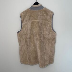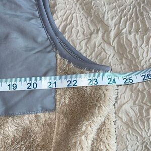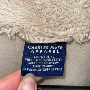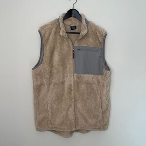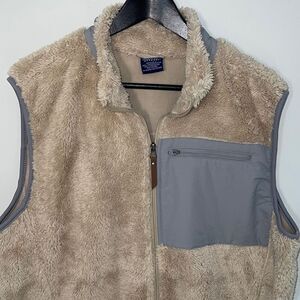 Charles River Apparel Womens Fleece Newport Vest Full Zip Size XL Tan Gray Stand Up Collar Pocket Sleeveless Faux Leather Zipper Pull.