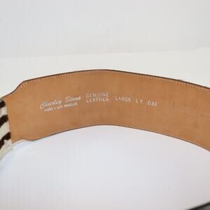 Bold and stylish Charley Stone wide belt featuring genuine leather with a zebra print hair-on-hide design. Large textured silver-tone round buckle adds a dramatic finish—perfect for cinching dresses, tunics, or layering over jackets. Marked size Large. Stamped inside: “Charley Stone Paris • Los Angeles Genuine Leather.”