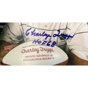 This signed Charley Trippi photo is a tribute to a remarkable sports legacy. Trippi, a legend in football history, was instrumental in the Chicago Cardinals' 1947 World Championship win. This memorabilia piece is ideal for avid collectors or fans of the game, celebrating a timeless athletic achievement.