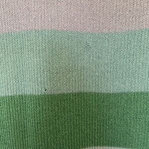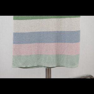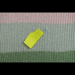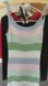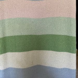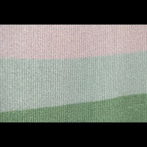 Pastel striped knit (64% Rayon, 22% Metallic Fiber, 14% Nylon). Sheath. Sleeveless. V-neckline. 46" from shoulder to hemline. 14" side slit. Imported.