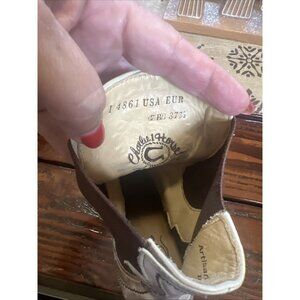 The Charlie 1 Horse Heavy Stitched Leather Studded Cowboy Boots in Size 7B are a stylish and unique pair of women's boots perfect for a variety of occasions. Featuring a pointed toe, high block heel, and ankle shaft style, these vintage-inspired boots are adorned with embroidered accents and stitched embroidery details. Made of leather with a cushioned insole, these boots have a Western cowboy theme and brown color that adds a touch of flair to any outfit. Ideal for parties, casual outings, or workwear, these boots are a custom-made piece with a geometric design that showcases the brand's quality craftsmanship.