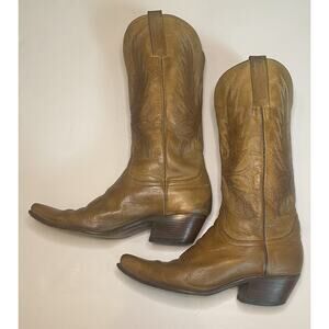 The product is a pair of Charlie 1 Horse Lucchese Tan Snip Toe cowboy boots in size 8.5B. These boots are designed for women and feature a Western style with a cowboy theme. Made of high-quality leather, they are a stylish and durable option for those looking for a comfortable and fashionable footwear choice. The Lucchese brand is known for its quality craftsmanship and these boots are no exception, making them a great addition to any wardrobe for those who love the Western look.
