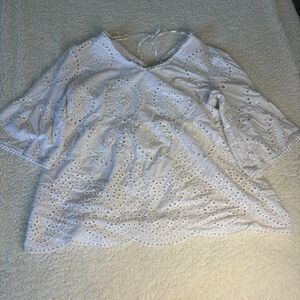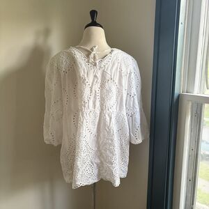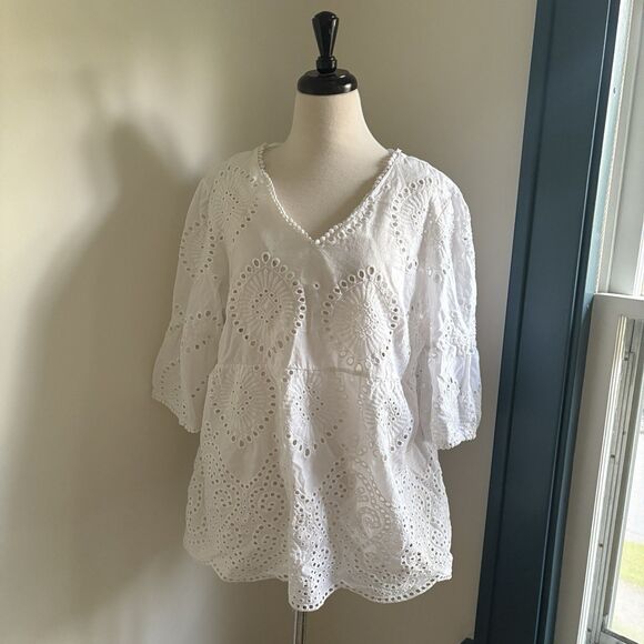 Keywords: white tunic top, eyelet blouse, boho top, summer top, beach cover up, women's top, plus size top, TG/XL blouse, embroidered top, lace detail, v-neck top, 3/4 sleeve top, casual blouse, vacation wear