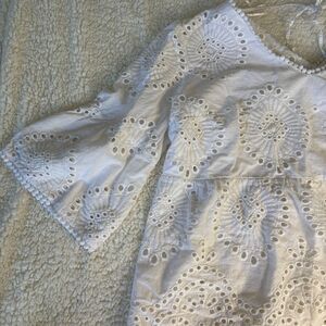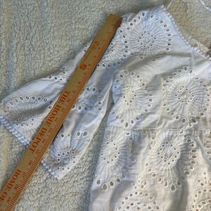 A beautiful white eyelet tunic top designed with intricate circular patterns and delicate trim. This top features a flattering V-neckline with a subtle beaded edge and a tie closure at the back. The three-quarter length bell sleeves and flowing silhouette create a bohemian and airy feel. Perfect for a beach cover-up, a casual day out, or a summer vacation.