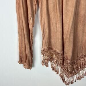 Gently Used Charlie B Long Sleeve Top. This is a women's small. I'd describe the color as peach, kind of a yellow / orange. White accents. Mesh shoulders. Intricate frills at the hem. Very soft and lightweight. 100% rayon. Made in Italy. Cute for summer! Shoulder to hem is