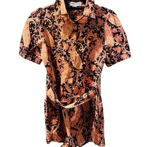 This Charlie Holiday Anthropologie Romper is a stylish and colorful addition to any wardrobe. The paisley pattern is eye-catching and the short sleeves make it perfect for warmer weather. The romper comes with a belt to cinch in the waist and create a flattering silhouette. It is available in size XS for regular size types and features a belted design. The multicolor Romper is perfect for women who want to make a statement and stand out from the crowd.