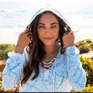Charlie Holiday Coco Coverup, lightweight cotton blend fabric, v-neck lace up with tassels, hood