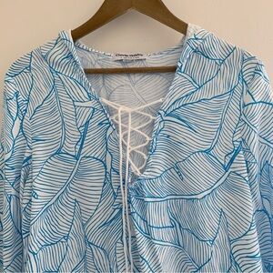 Charlie Holiday Botanical Print Swim Cover Up 6 Hooded Blue White lace up neckline with tassel tie hooded hi/low hem chest 20" length 33" Condition: Excellent pre-owned condition with no flaws