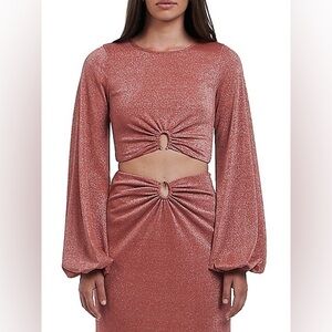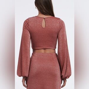 Exaggerated blouson sleeves and a cropped bodice make this shimmery lurex top a standout this season. Coordinate it with the matching Anouk skirt and platform heels for a dressy night-time ensemble.