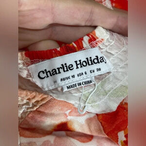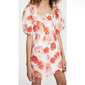 Charlie Holiday NWOT Bradley Floral Rose Linen Blend Puff Sleeve Mini Dress Women’s US Size 6. Features a square neckline, short puff sleeves with elastic cuffs, full liner, hidden side zipper, and smocked elastic back. 55% Linen and 45% Cotton. Lining: 100% Rayon. Designed in Australia. Made in China. Machine washable. Has a tiny mark on the top front (pls see pic).