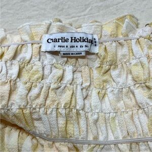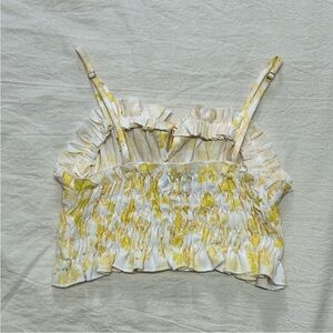 Chic floral camisole with delicate straps. Features a vibrant yellow and white pattern.
