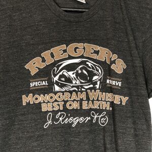 Heather gray with the iconic glass of whiskey on the rocks with the words: Rieger's Special Reserve Monogram Whiskey - Best on Earth - J. Rieger & Co.