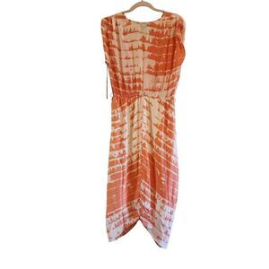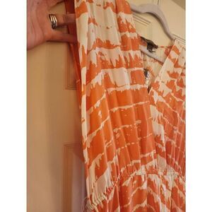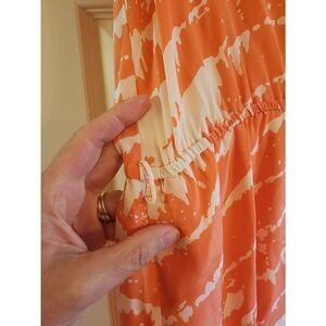 Charlie Jade brand dress with an orange and white pattern. The dress has a V-neck, an elasticated waist, and a slightly tulip-shaped hemline. Charlie Jade is a clothing brand known for its bohemian-inspired designs and use of silk fabrics. lightweight 100% silk. The pattern consists of abstract, brushstroke-like stripes in orange on a white background