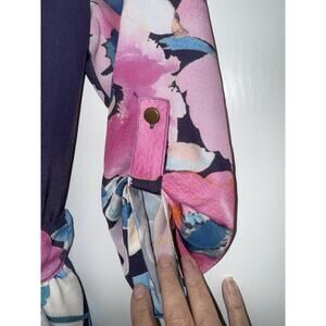 The Charlie Jade Floral Romper in size S/P is a vibrant and stylish one-piece outfit perfect for various occasions such as travel, activewear, parties, or casual wear. This romper features a beautiful floral pattern, a flattering V-neckline, 3/4 roll tab sleeves, and a convenient zip closure. Made from a comfortable knit fabric with a fun and colorful floral design, it also includes a matching tie belt in the set. Ideal for the summer, spring, and fall seasons, this romper embodies a bohemian and stylish theme that is sure to make a statement.