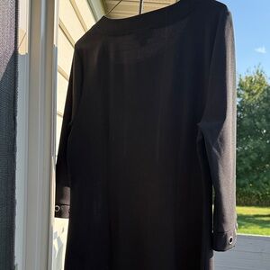 Chic black dress with long sleeves. Eyelet accents on neckline. Ideal for any occasion.