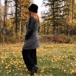 Features This multi media jacket is high in style. It has a tweed body in salt and pepper color, with vegan leather sleeves. It is completely lined. It has an asymmetrical zip front and two front zip pockets. Lapels are accented with pewter tone buttons. Wear over a dress, or for a more casual look, over jeans and booties.