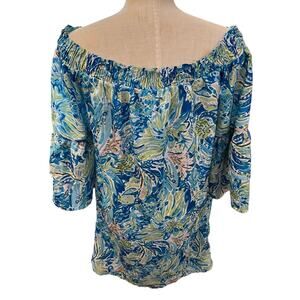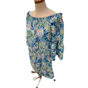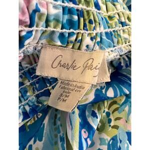 Charlie Paige Resort Wear Blue Watercolor Print Dress, size S/M. Good preowned condition, no materials tag but feels like polyester. Smocked neckline that can be worn off the shoulders and a relaxed loose shift fit. Elbow length bell sleeves