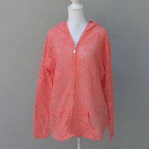 Charlie Paige Womens Jacket Size L-XL Open Weave Melon-Peach Hooded Zipper