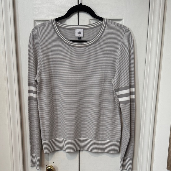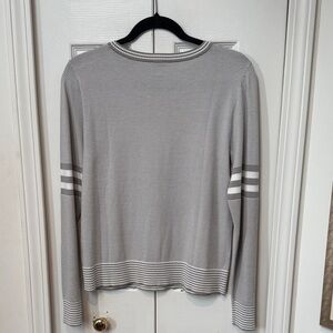 Light gray knit top with fine horizontal stripes. White stripe accents at cuffs and lower hem. Crew neckline. Casual, easy layering piece. Great with jeans, workout pants and shorts !