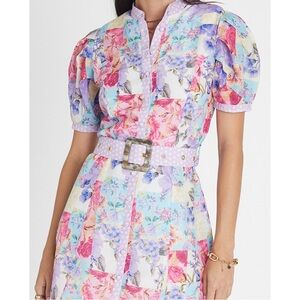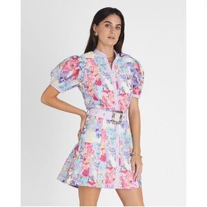 The Meadow Charlie Mini Dress by Aqua Blu Australia is crafted from a luxurious and comfortable cotton silk blend. Effortlessly chic from sunrise to sunset, this dress features a tortoise shell belt, puff sleeves and button through front.