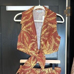 Stylish tie-front top and shorts set with a brown and yellow leaf print. Perfect for a casual outing.