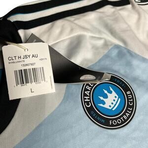 Brand new with tags — 2023 Charlotte FC Adidas Authentic Home Jersey in men’s size Large. This official MLS soccer shirt features a vibrant blue mountain landscape design with sponsor “ally” on the front, embroidered club crest, and AeroReady moisture-wicking technology. Slim fit. Model code HZ6175. Made in Colombia. Produced 04/2023.