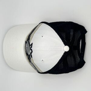 Authentic Charlotte Knights baseball hat with adjustable strap back. White front with gold & black trim, featuring team knight helmet logo. Mesh back.